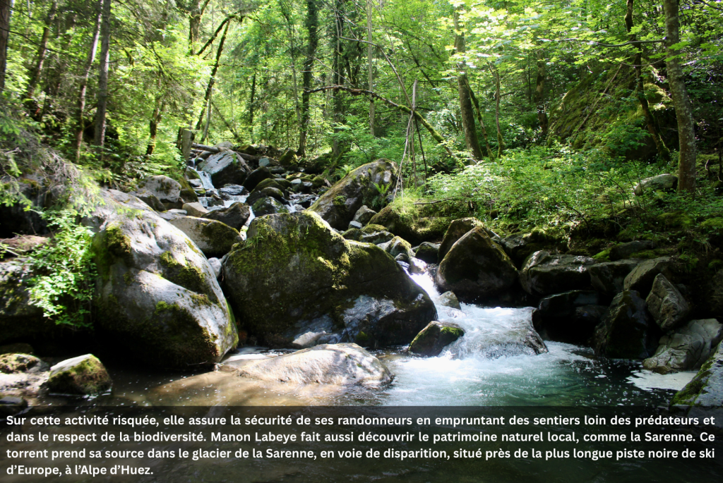 Ce métier lui permet de transmettre son amour pour le territoire en sensibilisant les touristes à la faune et à la flore locale. Debout devant la Sarenne, un torrent qui prend source dans le glacier éponyme, Manon Labaye témoigne de l’impact du réchauffement climatique sur les vallées de l’Oisans : « On est en première ligne, les glaciers fondent vite et il y a moins de neiges éternelles sur les cols. »